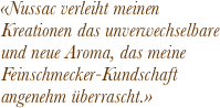 Charakterisierung Die grüne Baumnuss enthält ein breites Spektrum an Ätherischen Ölen und feinen Bitterstoffen. Aufgrund dieser Reichhaltigkeit bietet sie ein hervorragendes Ausgangsmaterial für die Création eines Apéritif oder Digestif; deshalb ist der Nussac ein echter und idealer Digestif. Nussac in Jahrgangsklasse vergleicht sich am ehesten mit einem Armanac; so ist der Nussac das Resultat von Schweizer Tradition & Innovation. Die speziellen ätherischen Öle und zarten Bitterstoffe – über die notabene keine einzige Traubensorte verfügt – sind in der Haute Cuisine ebenso gesucht wie begehrt; denn sie erlauben die Herstellung feinster Saucen, edelster Desserts und raffinierter Cocktails. |